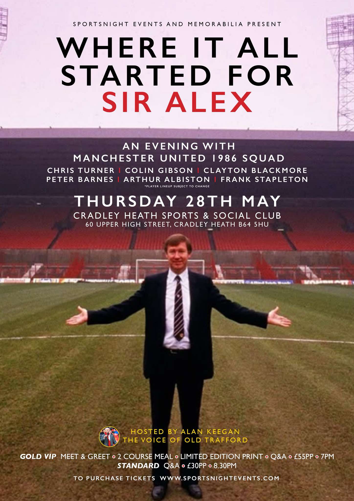 Frank Stapleton, Arthur Albiston, Clayton Blackmore, Peter Barnes, Chris Turner & Colin Gibson hosted by the voice of Old Trafford Alan Keegan